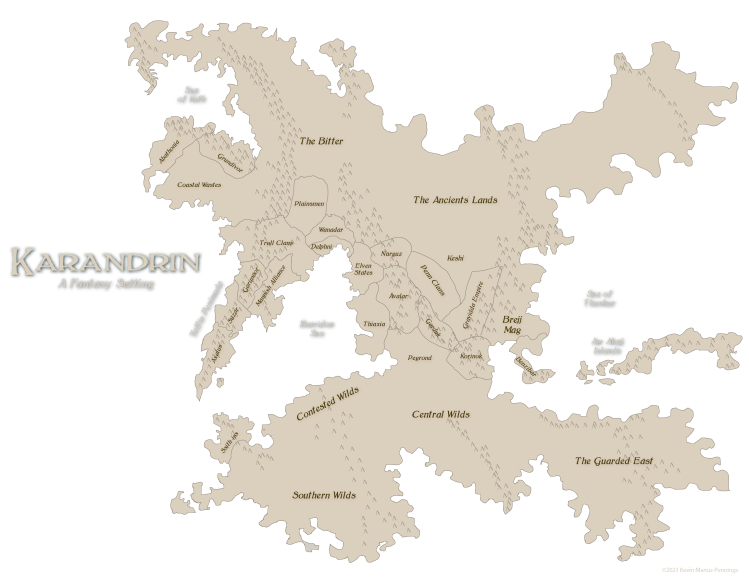 When creating Karadnrin, I drew this world on graph paper. I sketched out the borders, added details, and began building this continent. All of my players start in Convergence, which is at the borders of the Elven States, Thiaxia, and Avalar. As the paper aged, technology advanced so that I could save my map digitally.